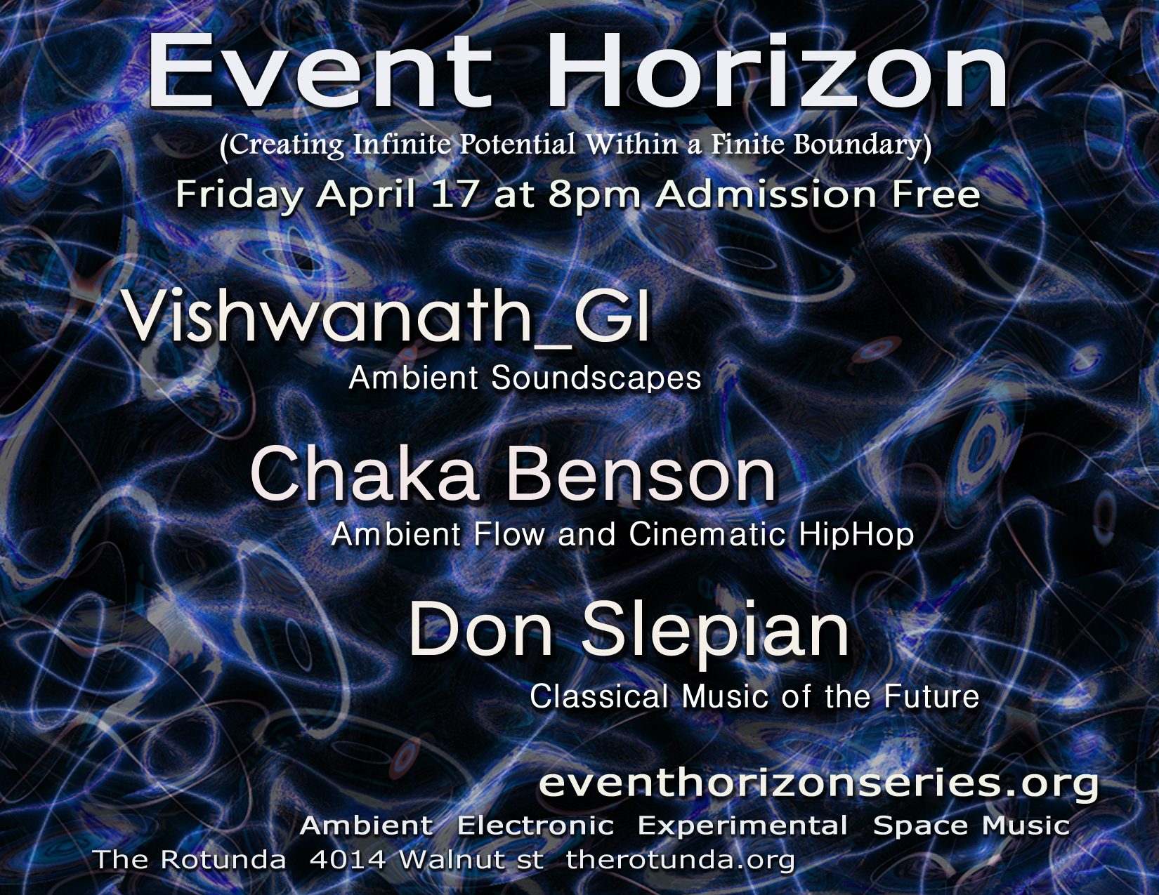 The Event Horizon concert series features Electronic, Avant Garde, and Experimental music along with the work of live video, laser and analog projection artists. The concerts are always free and open to all.