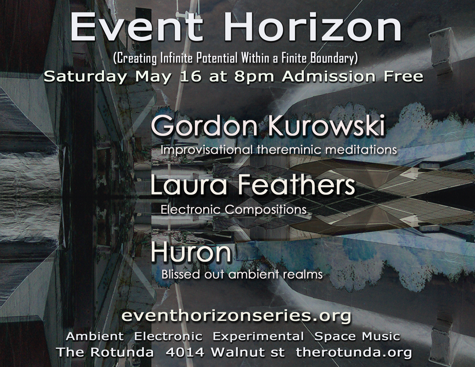 The Event Horizon concert series features Electronic, Avant Garde, and Experimental music along with the work of live video, laser and analog projection artists. The concerts are always free and open to all.