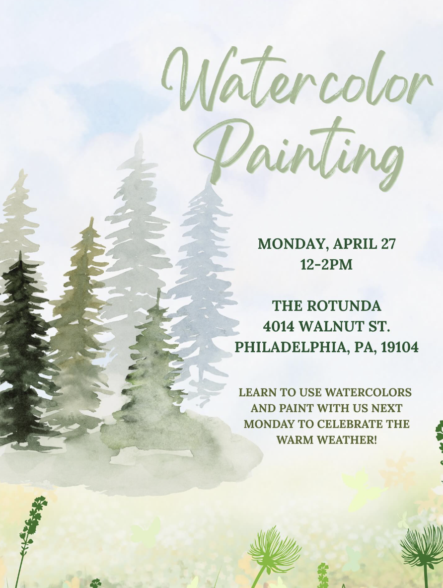 West Philadelphia Sanctuary (WPS) invites you to watercolor painting this Monday, April 27th! All supplies will be provided and the event is completely free, like always. Join us for an afternoon of creativity, anytime between 12-2pm :)