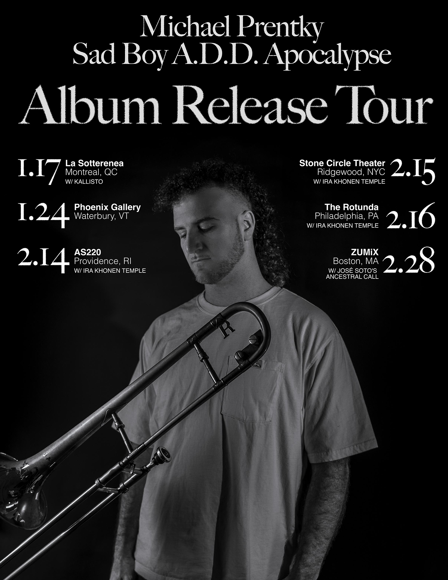 From January 17 - February 28th 2026, Boston-based trombonist Michael Prentky will tour his debut album, sad boy:ADD:apocalypse, across the Northeast U.S. and Canada. His orchestra includes a string quartet, 4 trombones, tuba, and rhythm section. Prentky will conduct, play trombone, sing, and recite original poetry. In addition to performing the entire album, Prentky will be premiering new original Klezmer compositions. He’s bringing a fresh perspective to Klezmer music with his high-energy trombone band and harmonically-rich compositions while staying rooted in Klezmer traditions. He'll be teaching audiences traditional corresponding Yiddish line dancing, such as the zhouk (aka hora) and terkisher, with the intention of reviving endangered dance steps.