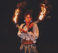 Ambra Robinson, aka Ambra Renee, is a Philly-based fire performer. Her journey with fire spinning began in 2017 after performing with Setu Tribe in the great circle at “the big burn.” Inspired by her Setu sisters and the PEX community, she continues to tell her stories through movement and fire dancing. Her favorite prop is fire fans. Ambra is also a radio co-host on 98.5 FM’s “Uptown Date Night.” When she’s not spinning fire, Ambra enjoys experimenting with flow props while roller skating.