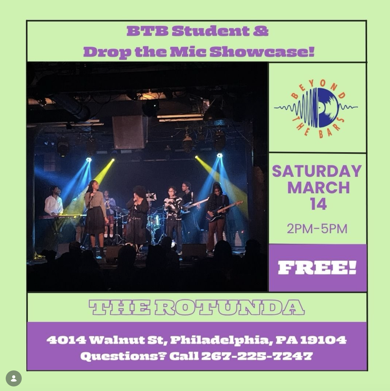Join us for an afternoon celebrating the incredible creativity, talent, and leadership of young artists from the Beyond the Bars community. Students will take the stage to perform original music, collaborate with peers, and share the work they’ve been building in BTB programs across Philadelphia.