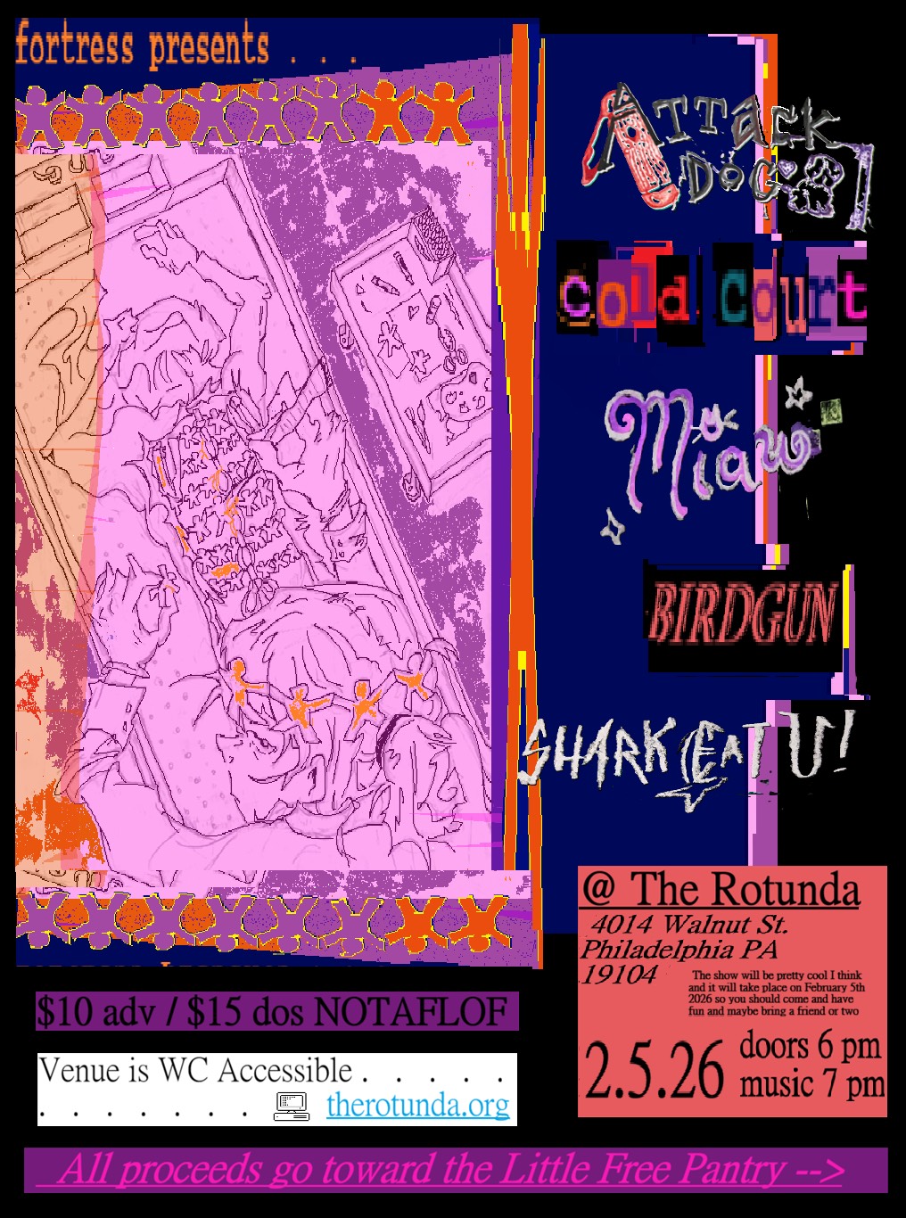 $10 advance, $15 at the door. No one turned away for lack of funds. All proceeds benefit the Little Free Pantry (LFP), a set of mutual aid cabinets outside of The Rotunda's east entrance where most people enter the venue. LFP is a resource for all people. You can leave/take items 24/7. The cabinets are never locked, and have all types of supplies. At times, the cabinets are completely bare, especially nowadays as more people visit them throughout the week. Money is needed to ensure we have some stock when the public is not able to donate.
