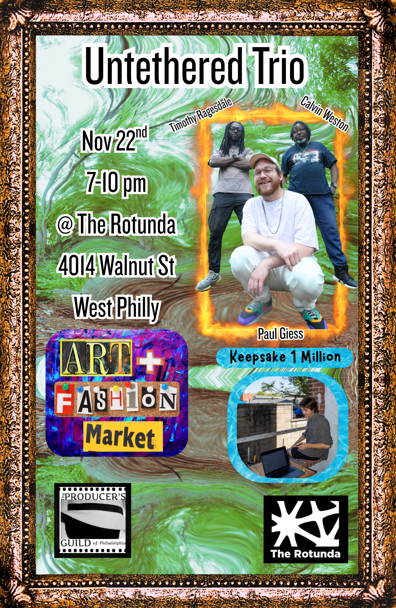 The Producers Guild presents a genre crossing evening of music, featuring Keepsake 1 Million and Untethered Trio. Keepsake opening with the intimacy of folk singer songwriter, and Untethered Trio bringing two sets of high energy improvised music from G Calvin Weston, Paul Gies and Timothy Ragesdale. Alongside the performance will be an art market, a curated selection of local artists and fashion designers with their creations available for sale.